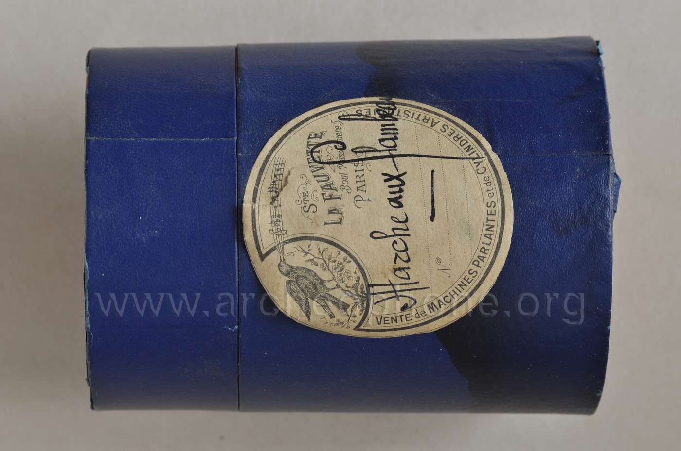 | Commentaire | Incomplet, manque quelques mesures vers 00:00:13, remplacées par quelques mesures repiquées de 00:02:04, également montage vers 00:02:18. Les images DSC_0286.JPG à DSC_303, 331, 332, 333, représentent des boîtes vides d'autres cylindres de ce curieux et rare format rencontré une première fois jadis dans la collection André Fildier, avec un mandrin approprié monté sur un Graphophone type N. |