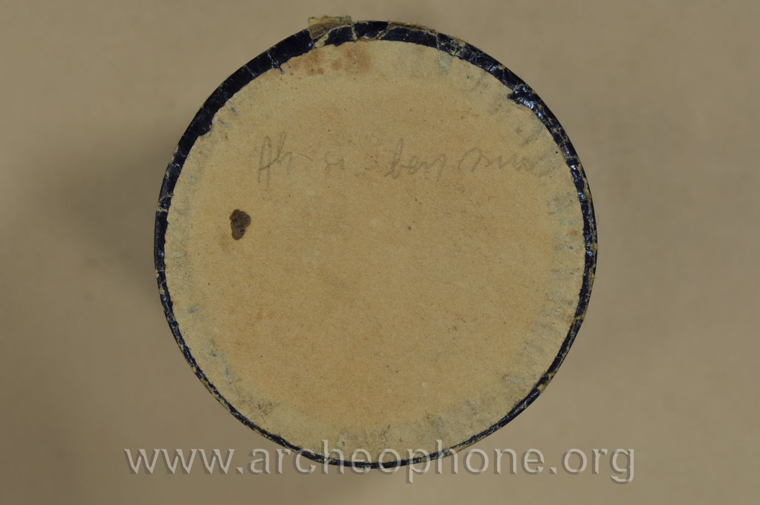 | Commentaire | Texte du contenu ci-joint. Henri Lioret n'a jamais eu la maîtrise technique de son propre brevet consacré au moulage et à la duplication des cylindres, c'est pourquoi on ne trouve jamais deux exemplaires de la même session d'enregistrement chez Lioret. Voir à ce propos : Henri Chamoux, La diffusion de l'enregistrement sonore en France à la Belle Époque, 2015, pages 204 à 214 du pdf. Hauteur celluloid 77mm |